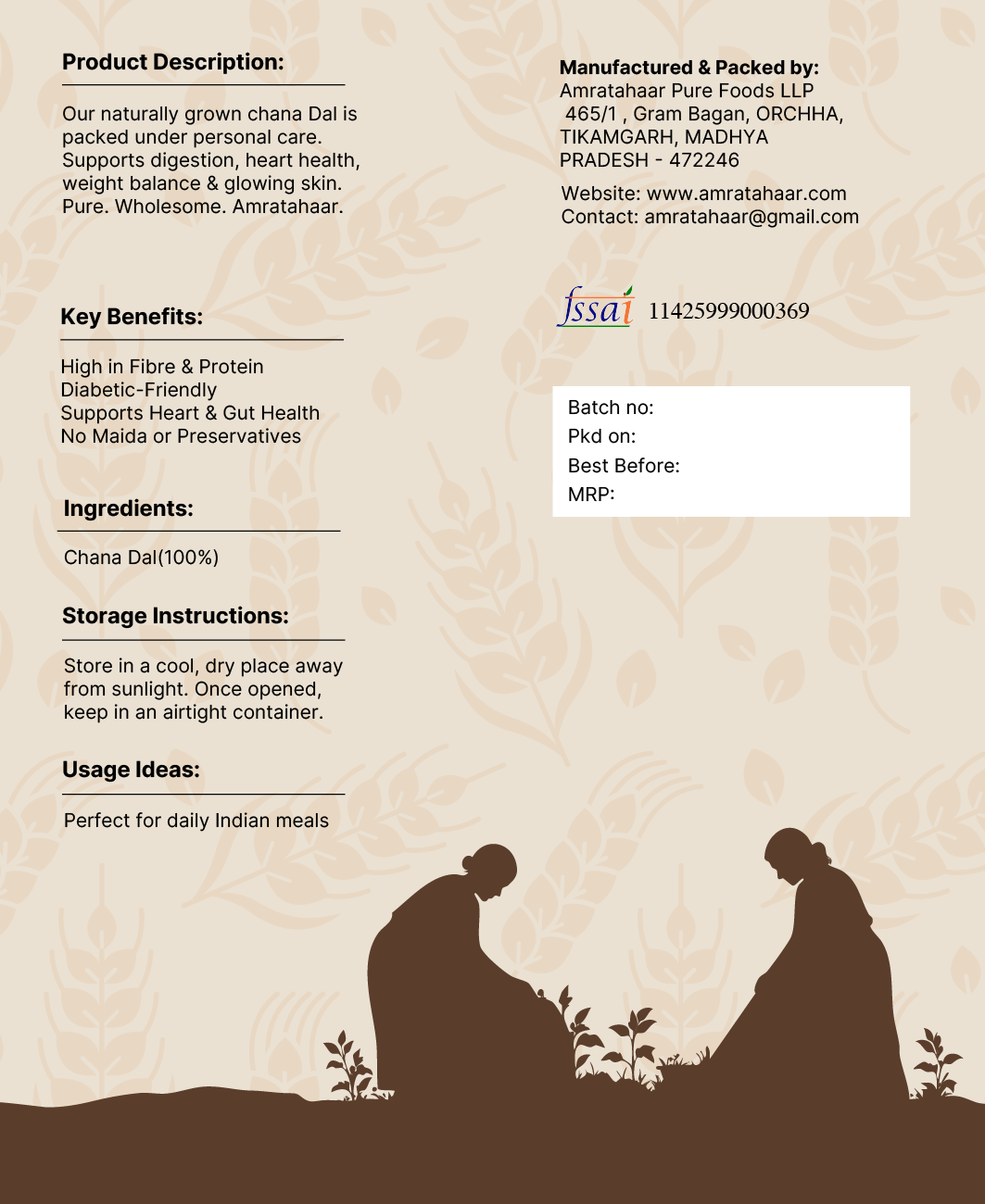 Just like our all home grown superfoods, Amratahaar’s Chana Dal (Split Bengal Gram) is grown and packed with protein, fiber, and essential minerals — making it a heart-healthy, digestion-friendly, and energy-boosting addition to your everyday meals.