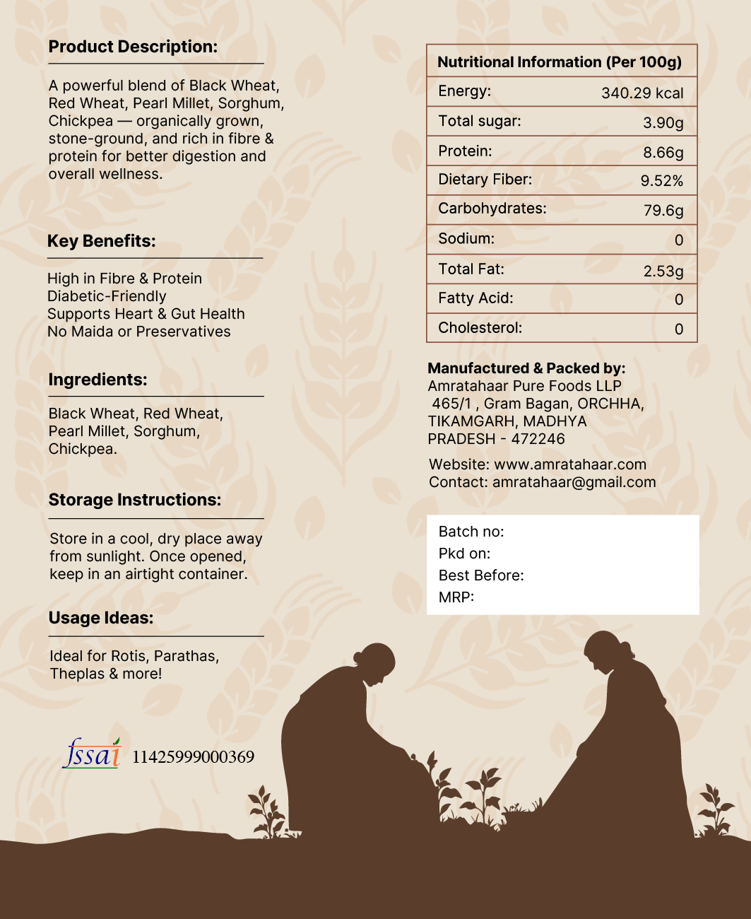 Amratahaar’s Multigrain Atta is a thoughtfully crafted blend of five powerful grains — Black Wheat, Red Wheat, Pearl Millet (Bajra), Sorghum (Jowar), and Chickpea (Besan) — each selected for their unique health benefits and rich nutritional profile.